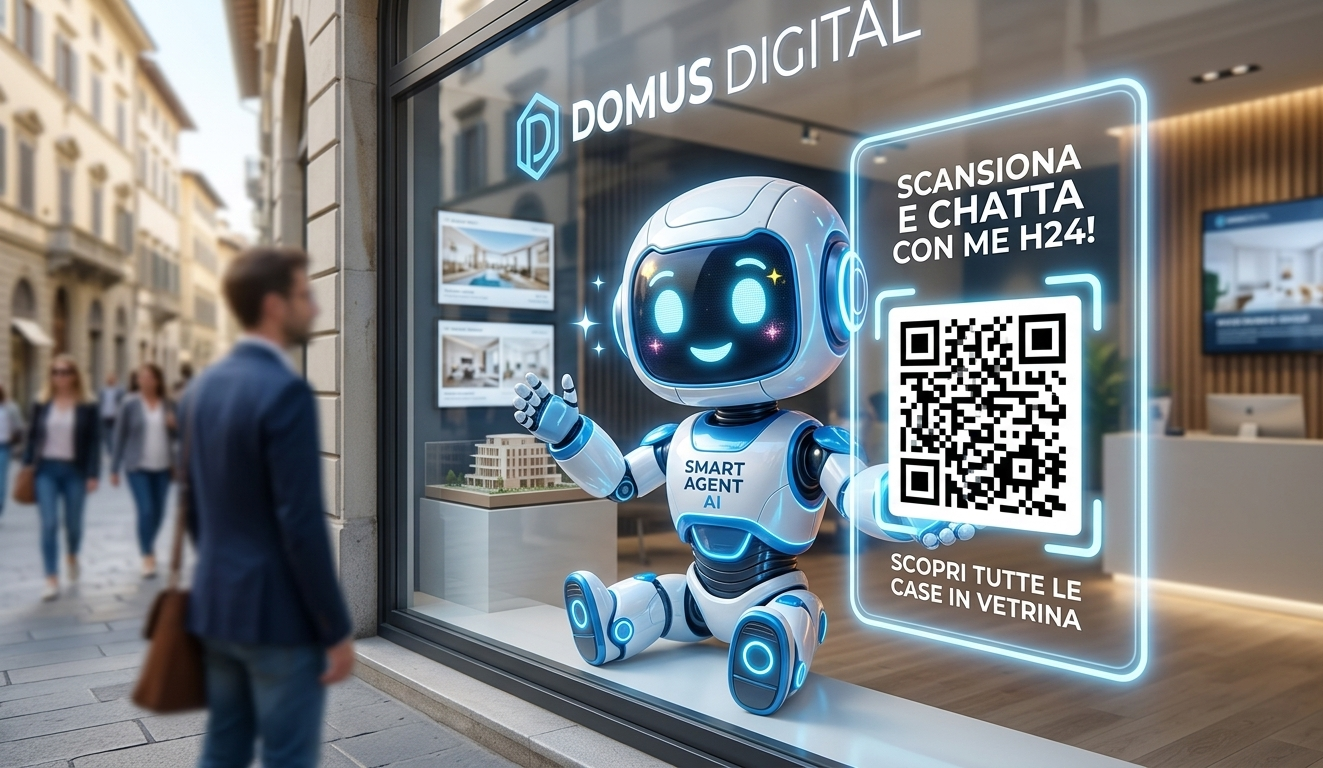 Trasforma la tua vetrina in un ufficio digitale attivo 24/7. La mascotte adesiva invita i passanti a scansionare il QR per ricevere informazioni istantanee sugli immobili esposti.